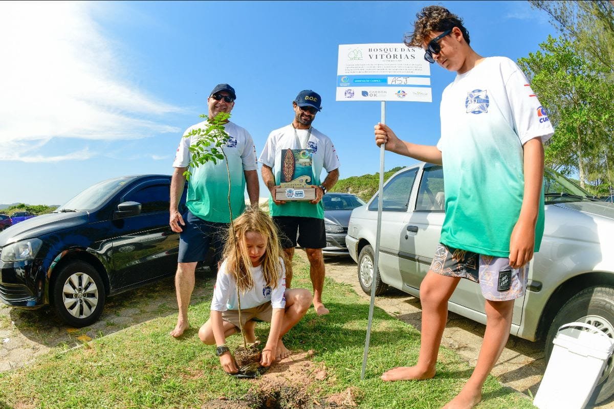 Criado em 2023, o Bosque das Vitórias é um projeto ambiental da ASJ que une sustentabilidade e valorização esportiva. Atletas campeões plantam árvores nativas no estacionamento da Joaquina, e a própria ASJ agora também deixou sua árvore, eternizando o título de 2025.
