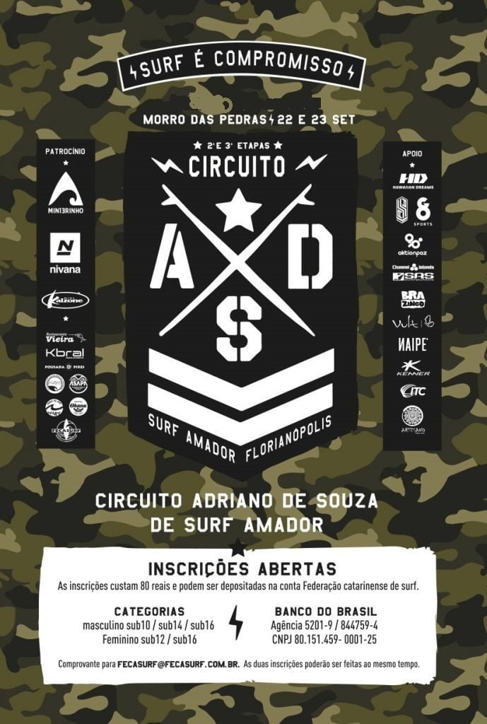 Já estão abertas as inscrições para 3ª Etapa do Circuito Adriano de Souza de Surf Amador que vai ser realizada nos dias 22 e 23 de setembro na Praia do Morro das Pedras em Florianópolis – SC. no valor de R$ 80,00 nas categorias masculino sub – 10, sub 14, sub 16 e no feminino sub – 12 e sub – 16.