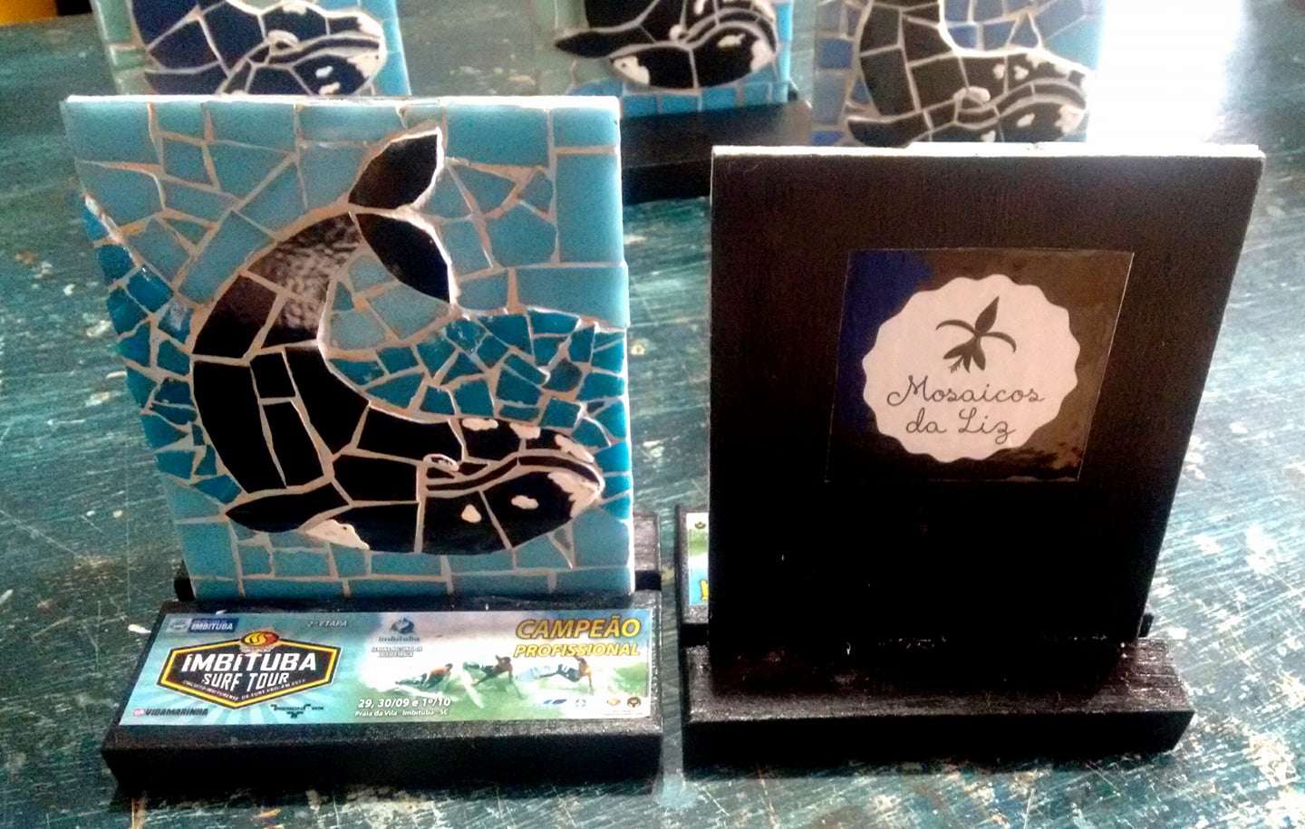 | Os Troféus do Imbituba Surf Tour valorizam o artesanato local através dos mosaicos da artesã Liz Panek. Foto Divulgação. |
