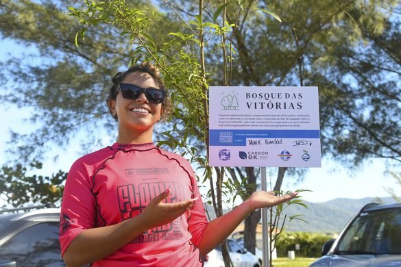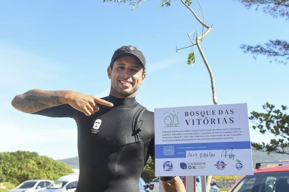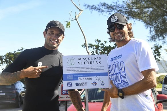 BOSQUE DAS VITÓRIAS – O Floripa Pro Etapa Joaquina inaugurou uma nova ação ambiental implementada pela Federação Catarinense de Surf no Circuito Profissional desse ano, o “Bosque das Vitórias”. Em todas as etapas, o campeão e a campeã vão plantar uma árvore com uma placa identificando seus nomes. Nesta primeira etapa, elas foram plantadas por Tainá Hinckel e Alex Ribeiro no estacionamento da Praia da Joaquina. E a Associação de Surf da Joaquina (ASJ) já anunciou que os vencedores de todos os próximos eventos na praia, também plantarão mudas no “Bosque das Vitórias” idealizado pela FECASURF.